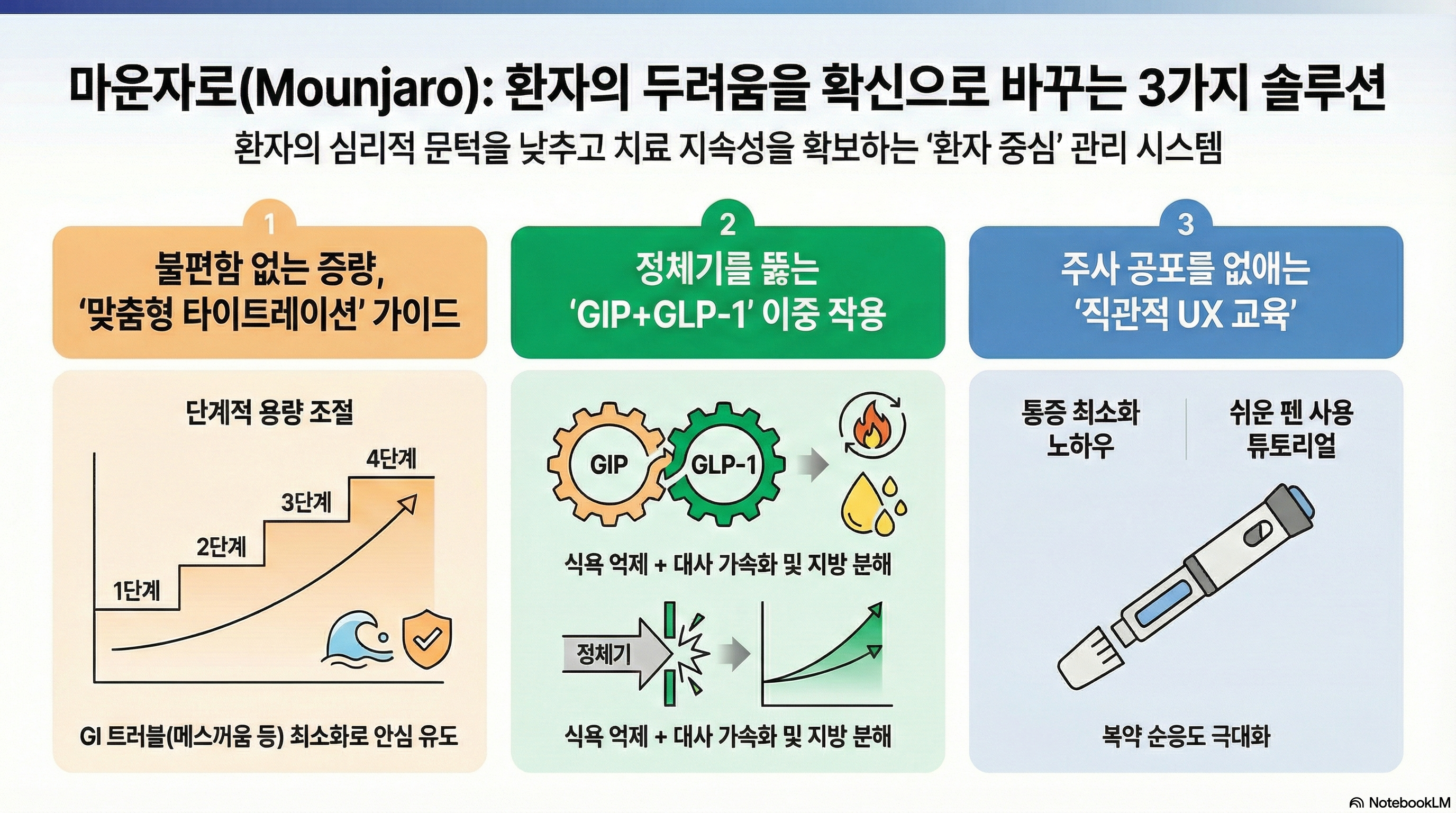 기존 GLP-1 단일제 치료에 한계(정체기)를 느낀 환자들에게 GIP 이중 작용 기전이 주는 '대사적 이점'을 알기 쉽게 설명할 수 있는 시각화 자료를 제작, 경쟁 제품으로부터의 스위칭을 가속화하겠습니다.